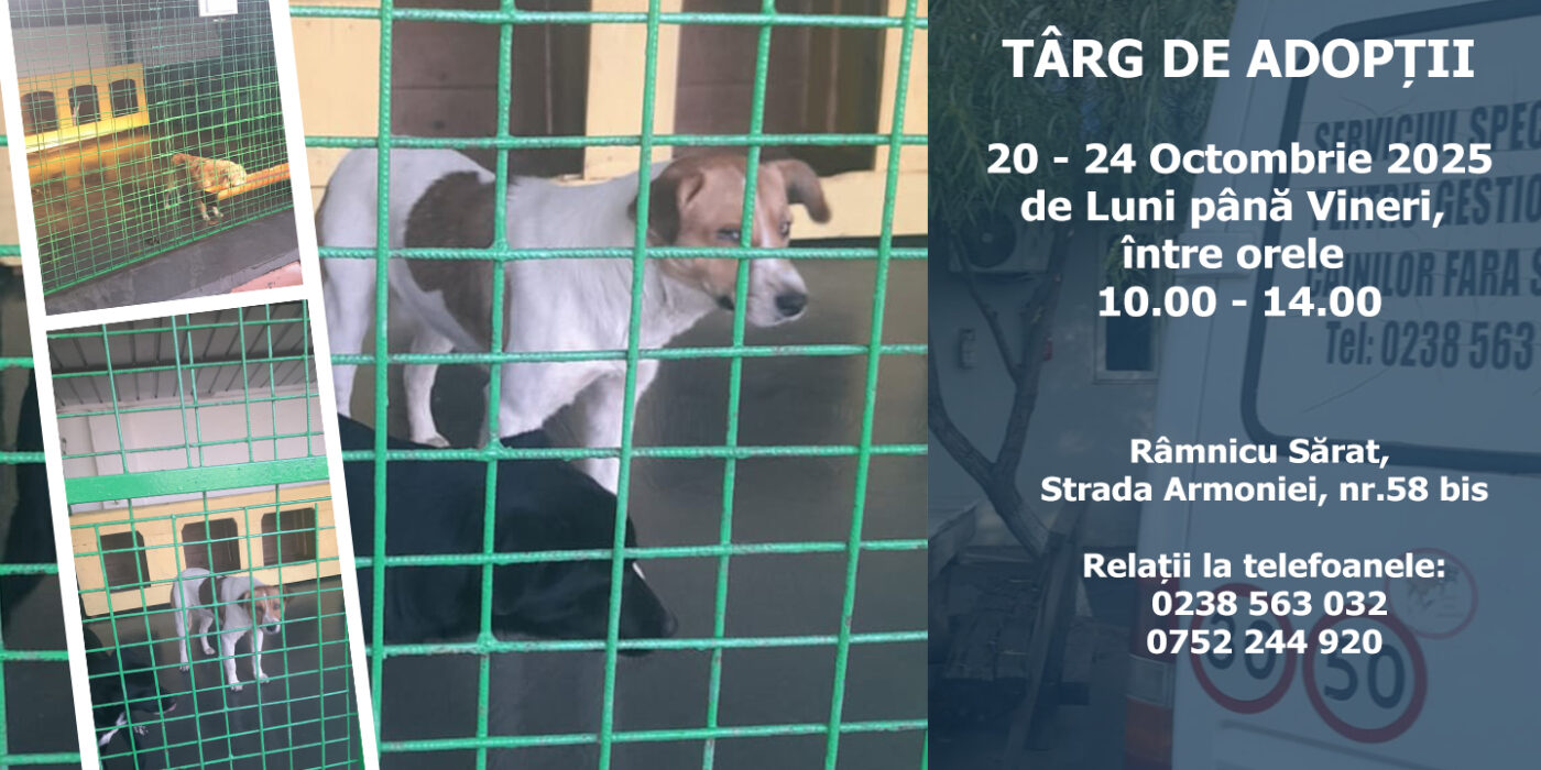 Serviciul specializat pentru gestionarea câinilor fără stăpân din cadrul ADP Rm. Sărat organizează în perioada 20- 24 Octombrie 2025 TÂRG DE ADOPȚII PENTRU CÂINII DIN ADĂPOST. Programul este de Luni – Vineri între orele 10.00 – 14.00. Cei interesați sunt așteptați la Adăpostul pentru câini fără stăpân din Str. Armoniei 58 bis. Relații la tel